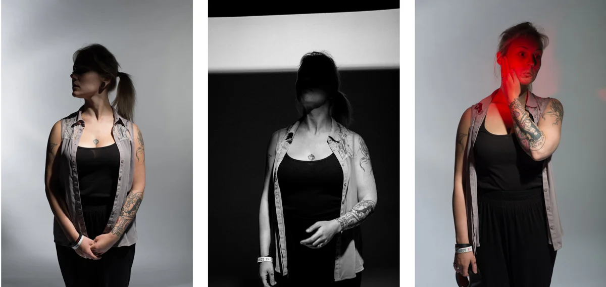We really wanted the light to 'cut off' - I.e. Stop the light quite dead with a harsh shadow - rendering the faces into pure shadow but illuminating the rest of the subject. We achieved this with a bare bulb and reflector above - this produces a harsh strong light which will cut off. We tried With a soft box but the light didn't achieve the effect we wanted and filled way too much of the face in. We used black reflectors at the side to really suck any additional light.