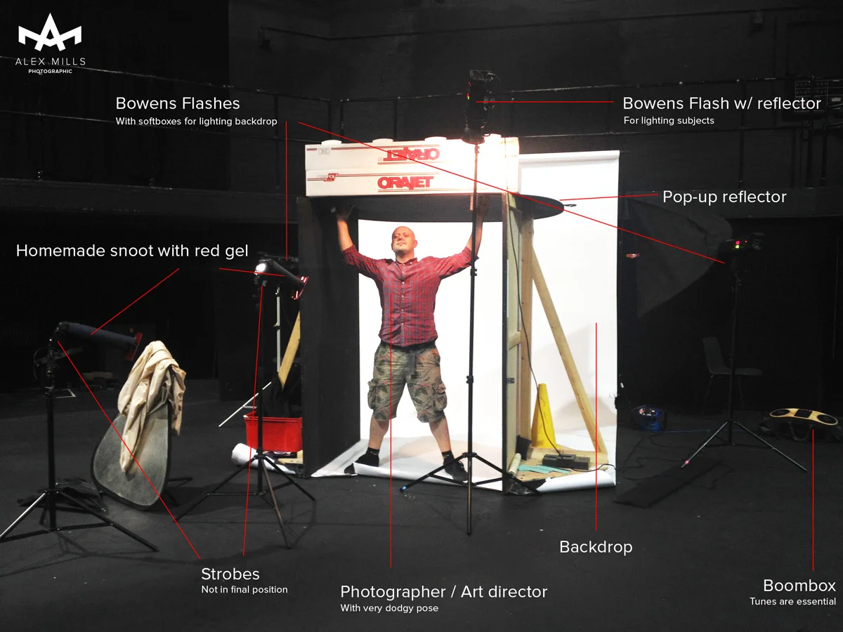 The image below shows the 'tent' we made on set. We had planned this in advance in my studio. Fortunately we had a large enough space to set it up. All the lighting was pretty much in place other than the strobes with the red gels - these were position on the fly when the subjects were in place.