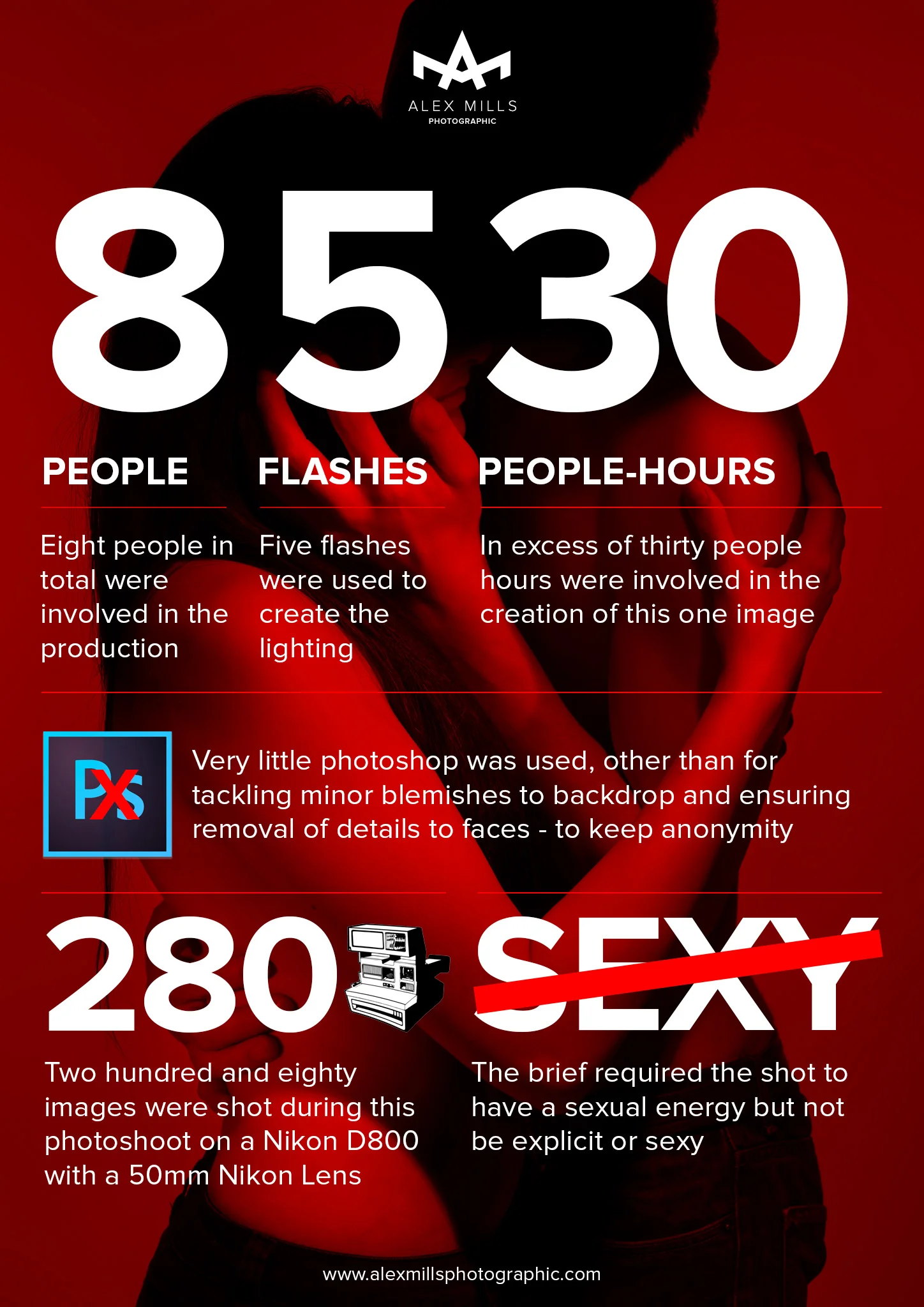 We did an initial tester shot or two - just to see if the concealed nudity idea would work and that the lighting did what we needed it to. This was one thing that we had to think on our feet on in the shoot as it didn't quite work - so we shuffled bodies around and tried a few different things (as is very much the way on shoots - you can only plan so much).