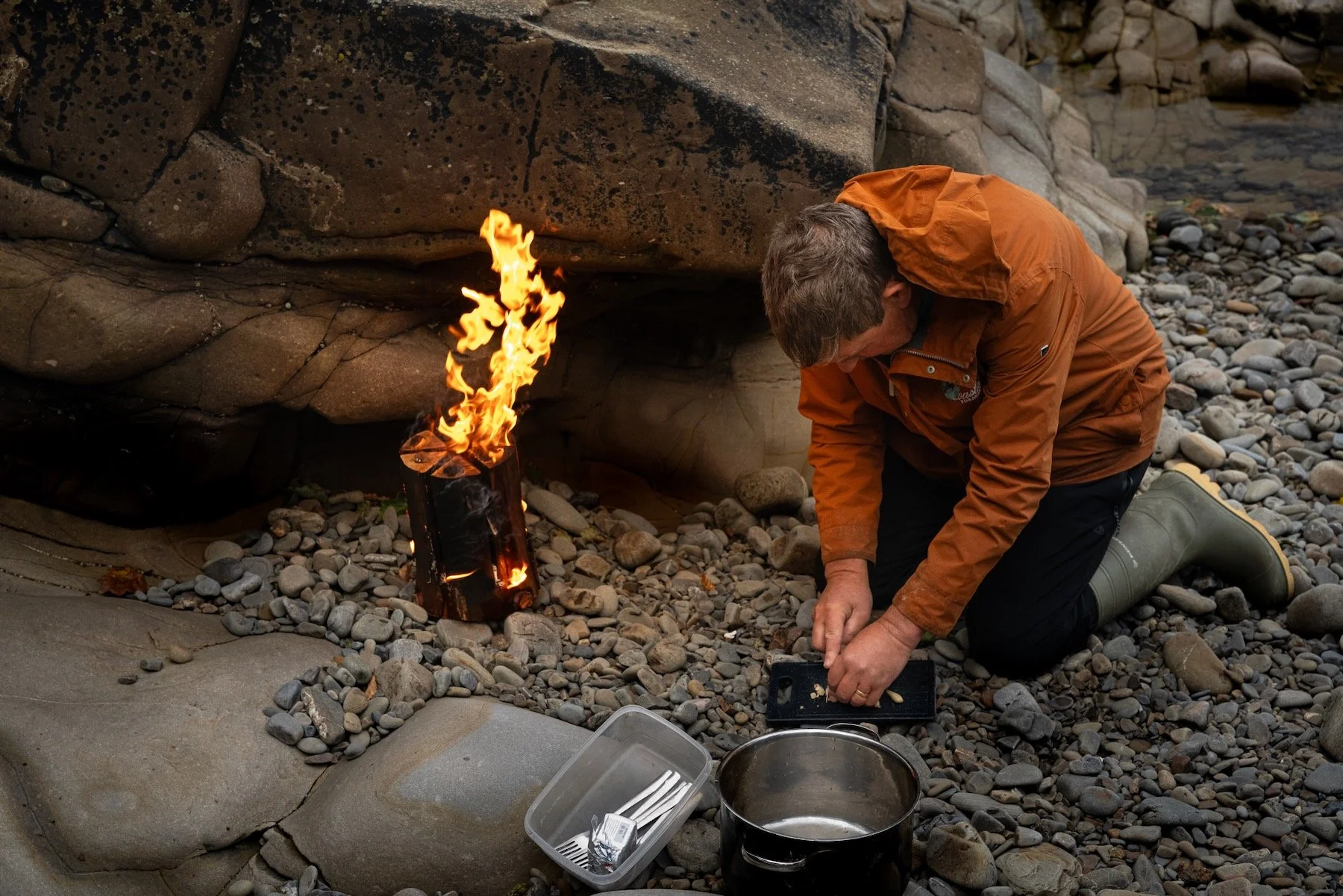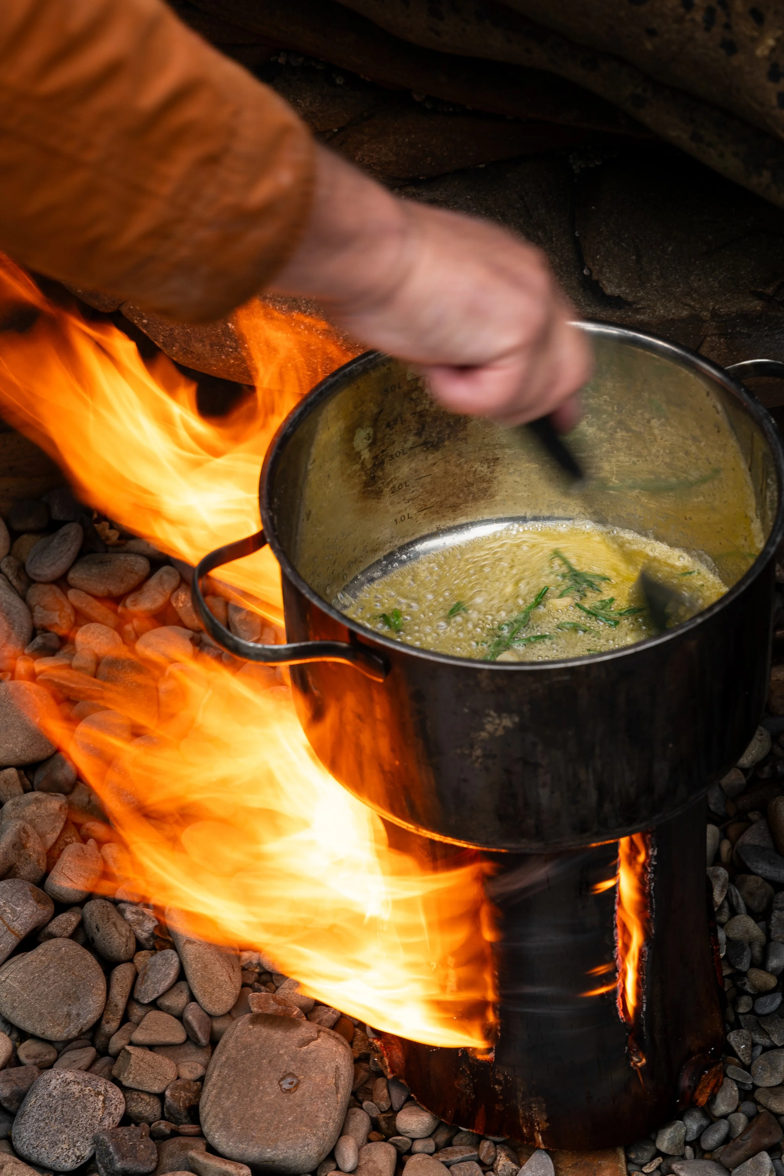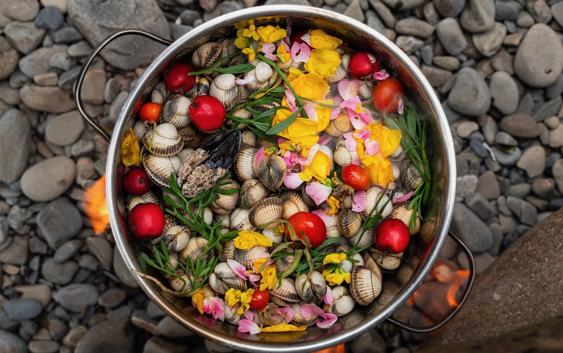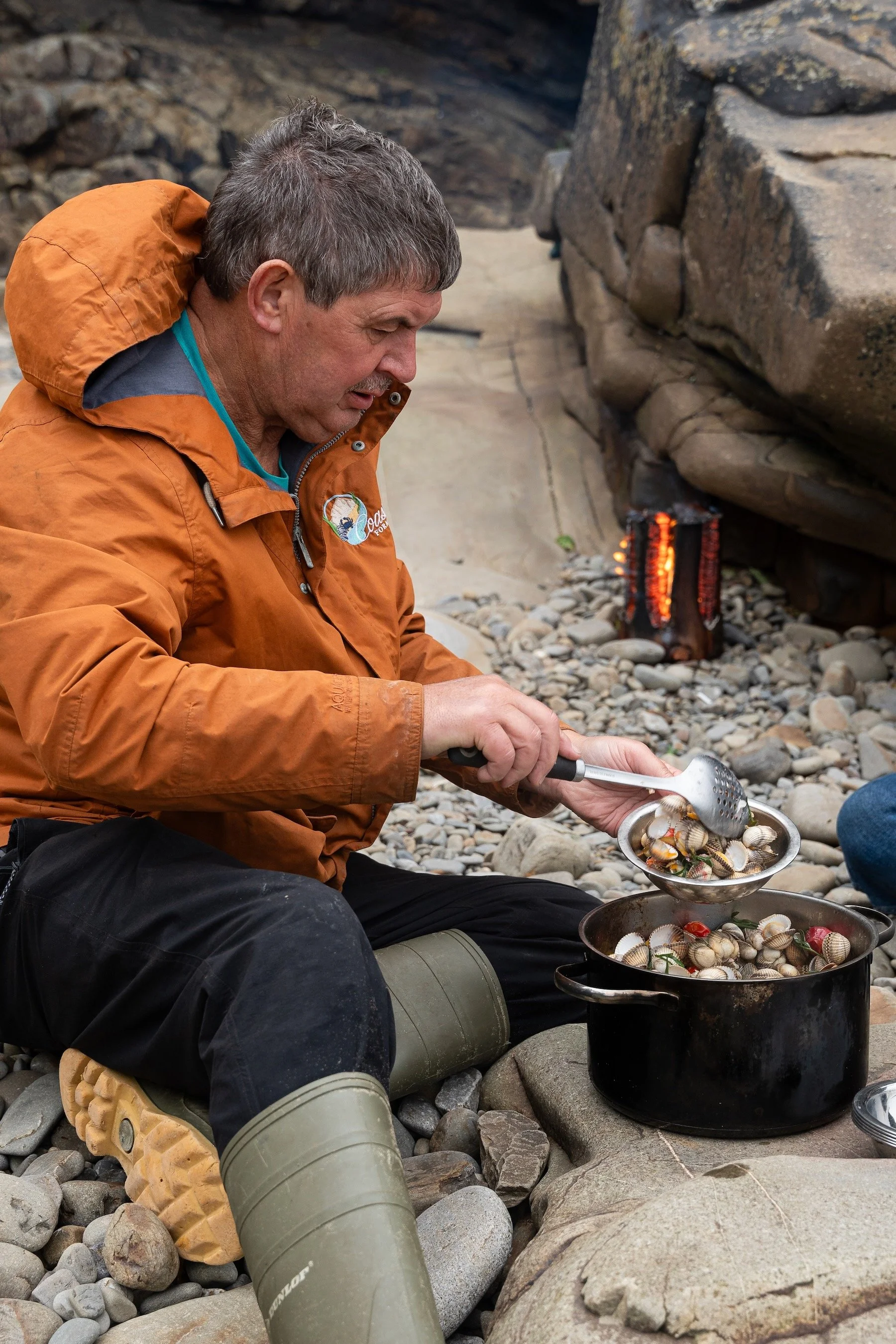Craig prepared and piled the wild garlic, cockles, oysters and soft shell clam into a pan with edible flowers, crab apples and rosehips he’d brought with him - he cooked it over his own ‘Solva stove’, a natural barbecue tool inspired by Scandinavian outdoor living.