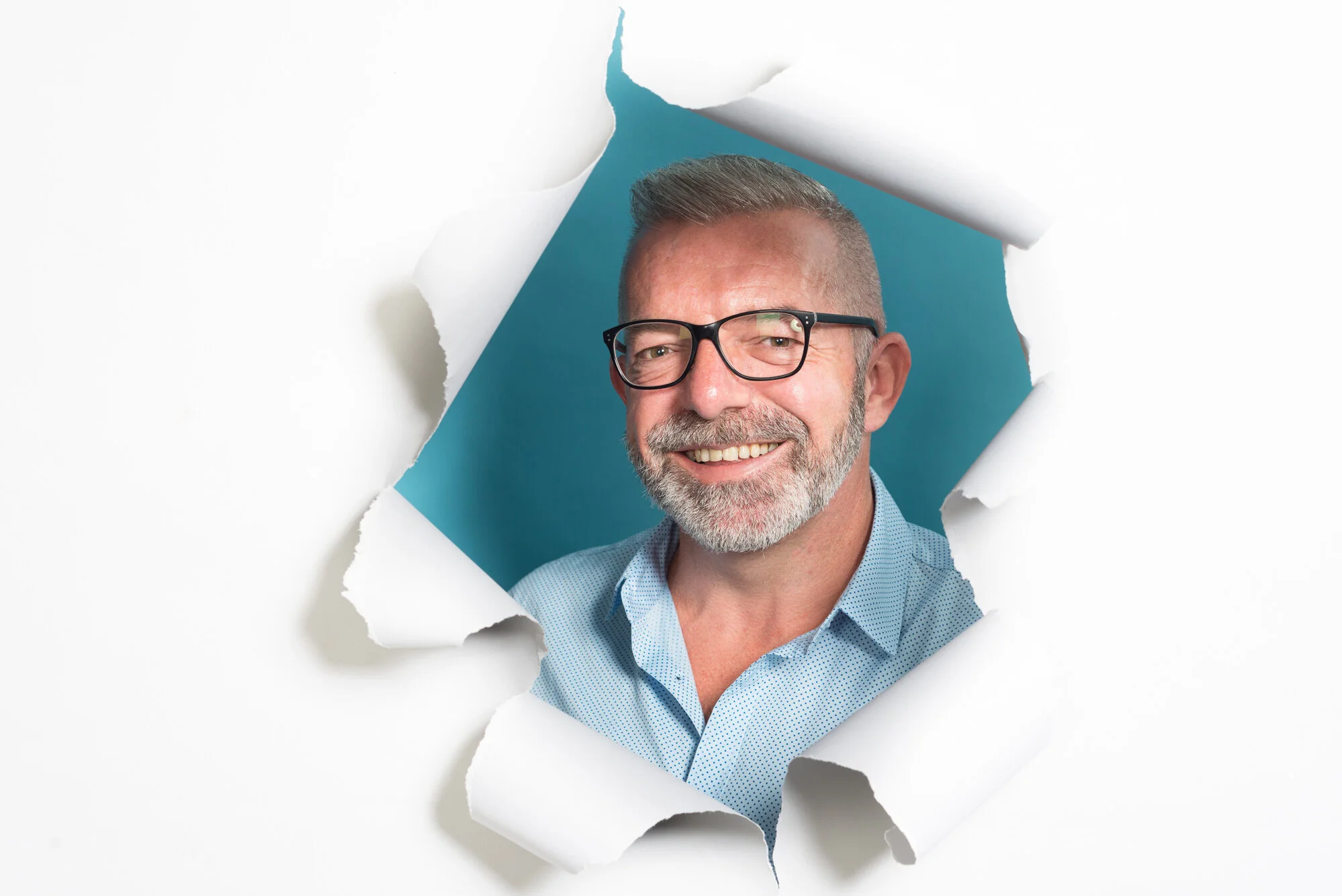 As part of his re-brand, John’s strapline was ‘break on through’ and this was the starting point for developing the idea into a photoshoot - with John breaking through the paper. This concept was even followed through on to business cards.